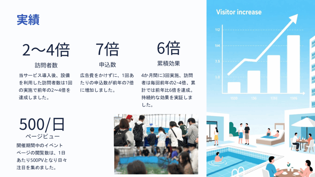 当サービス導入後、設備を利用した訪問者数は1回の実施で前年の2~4倍を達成しました。
